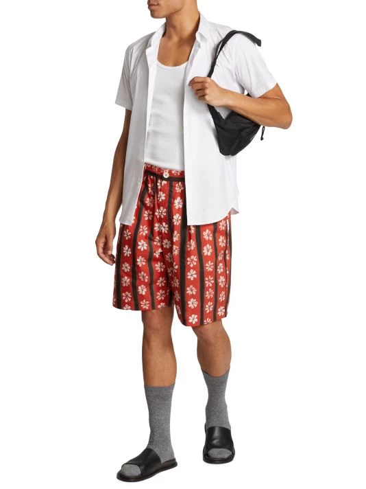 These pleated shorts showcase a painted-inspired daisy and striped print and an elastic waistband.