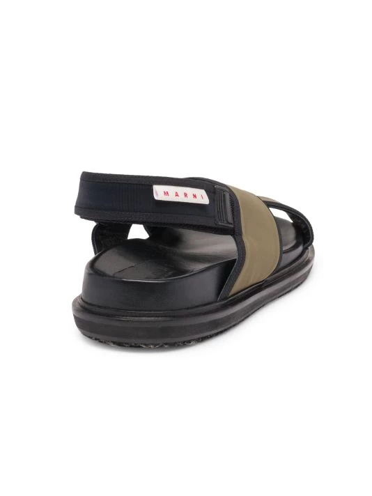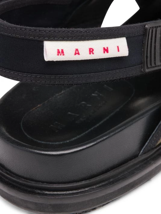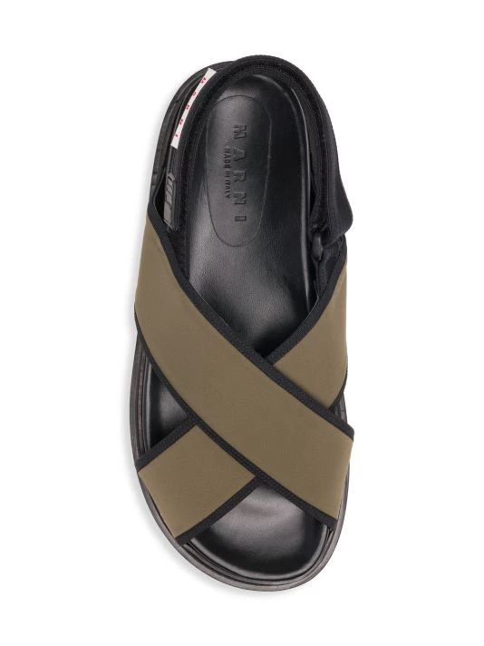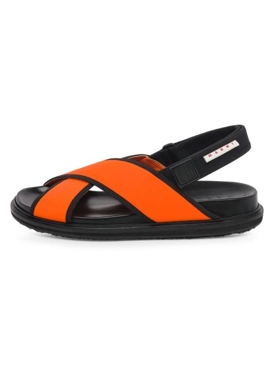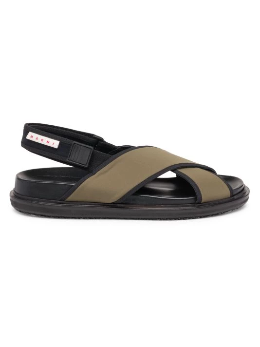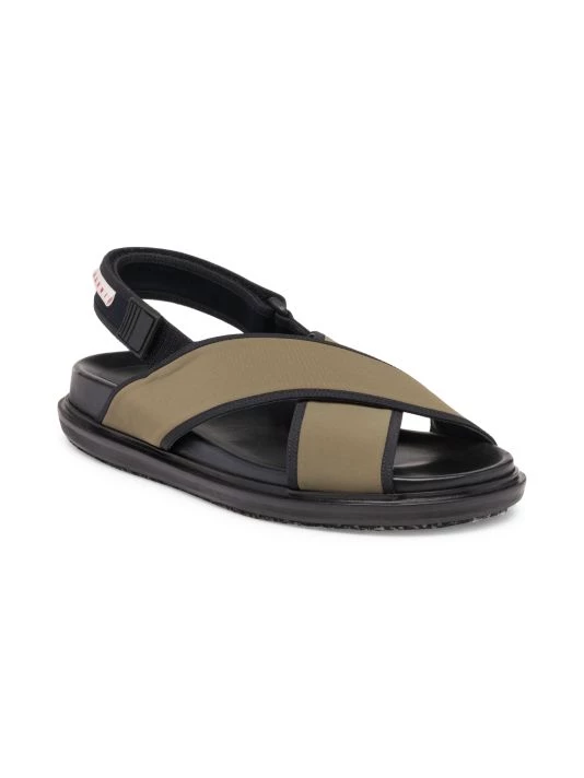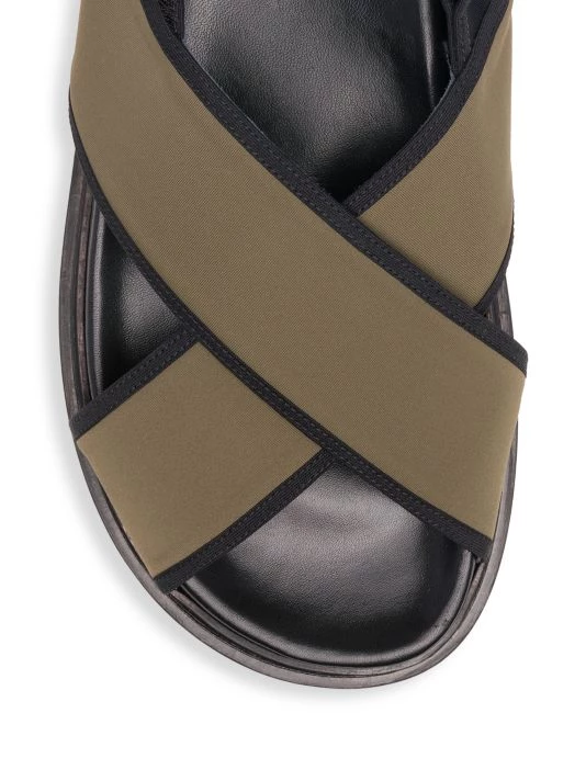 These low-profile sandals feature a sleek cross pattern with a leather upper and rubber sole.