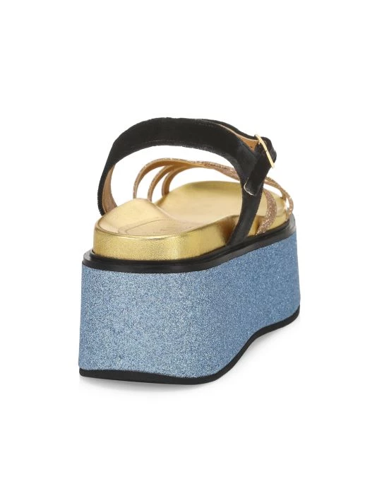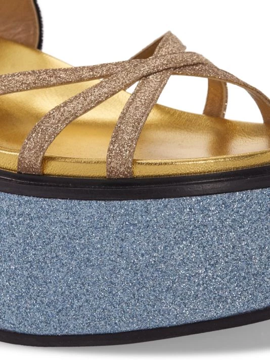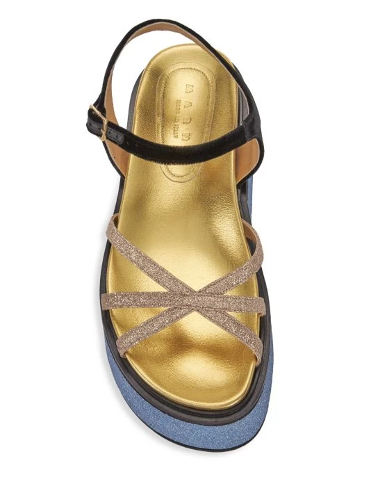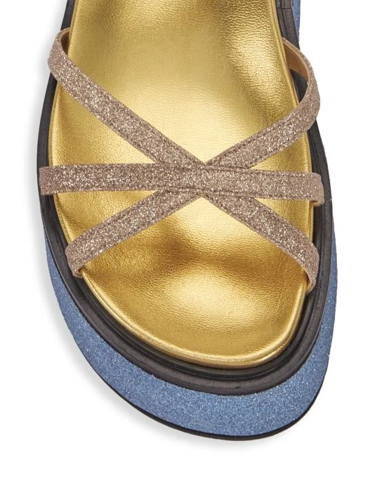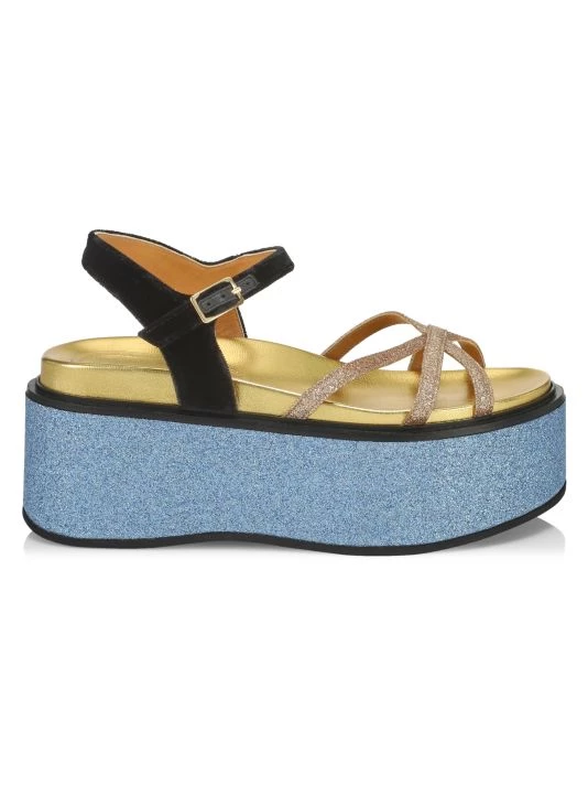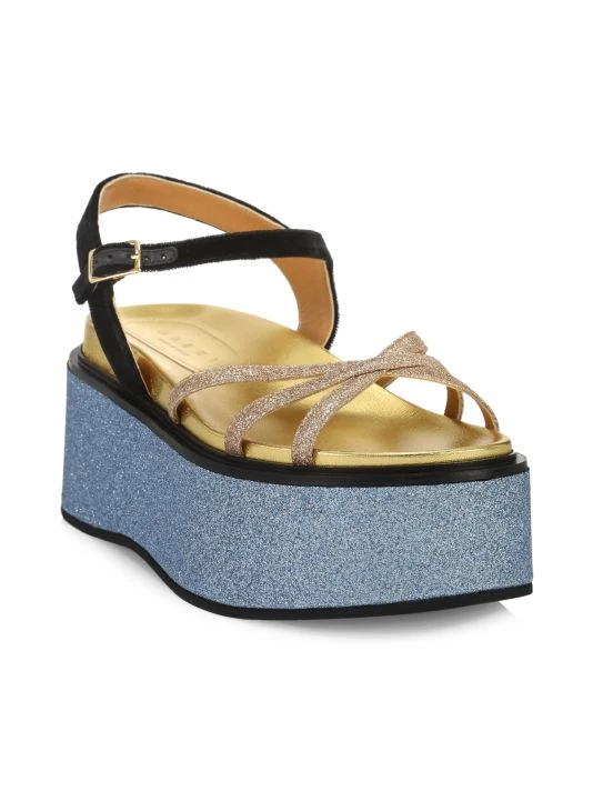 These flatform sandals from Marni are rendered in colorblocked glitter with a strappy design.