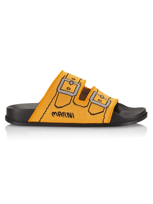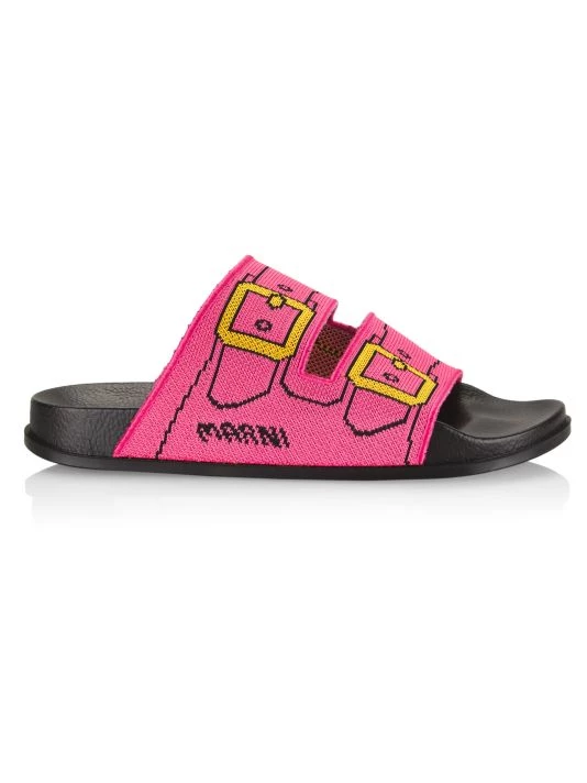 Set on a contoured footbed, these sandals by Marni are designed with a buckle-printed knit vamp. This Italian-made pair is finished with a signature logo at the sidewall.