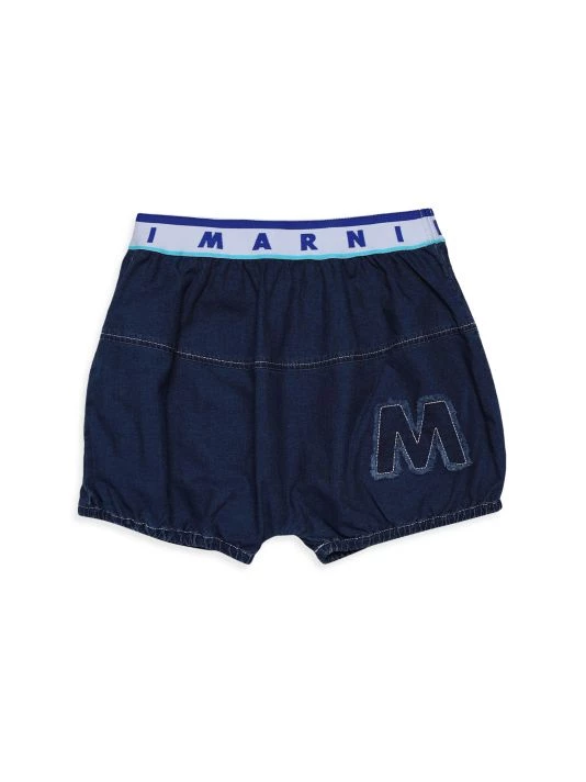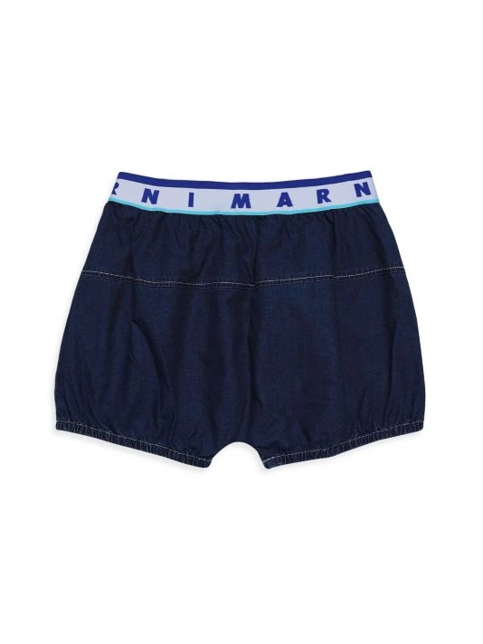 Crafted of 100% cotton denim, these shorts feature a bubble silhouette styled with an elasticized Marni logo waistband and a denim M patch with frayed edges.