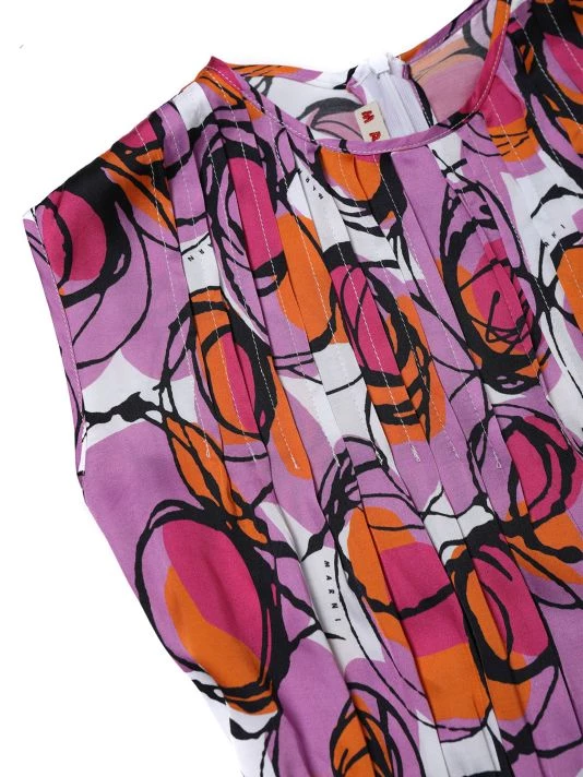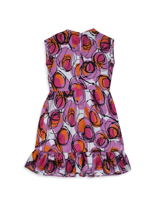 This sleeveless shift dress in a vibrant circular abstract print features pintuck pleated details at the front and a ruffle hem.