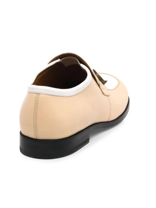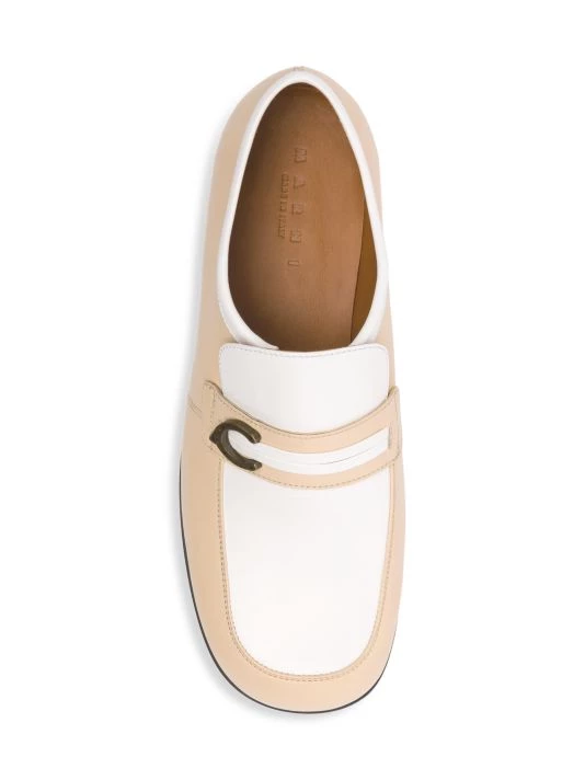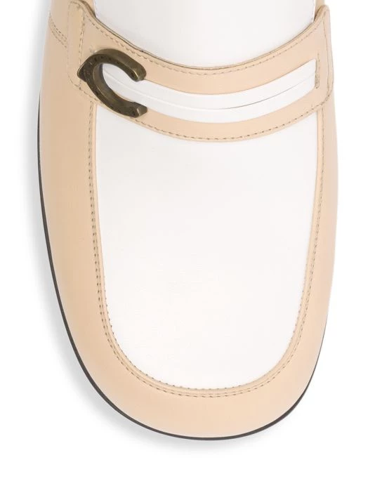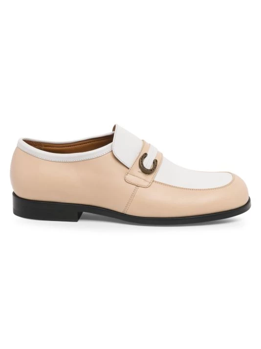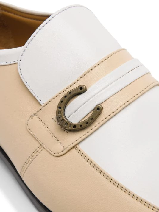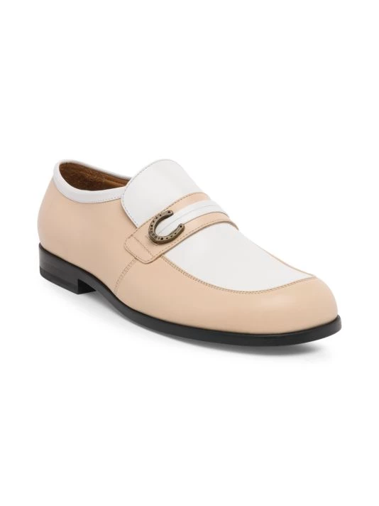 These leather moccasins are designed with a contrast panel at the vamp and an antiqued goldtone horseshoe at the side.