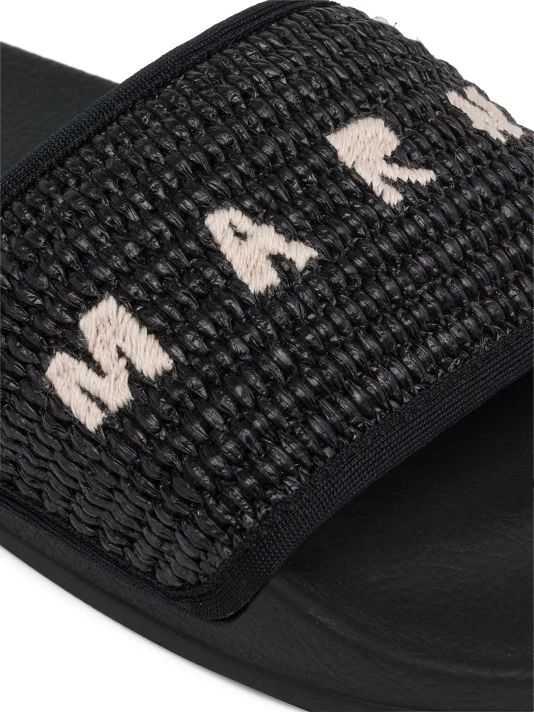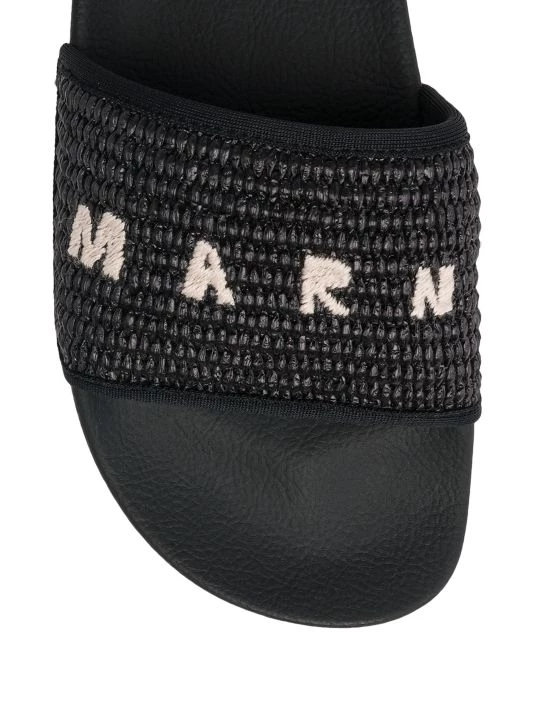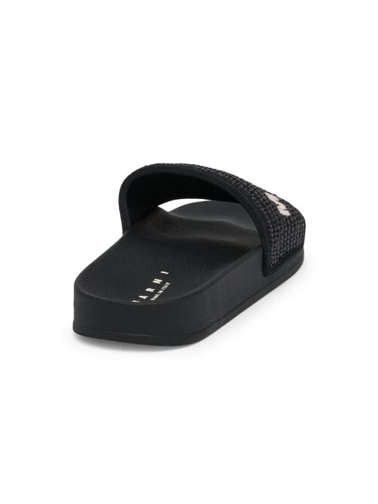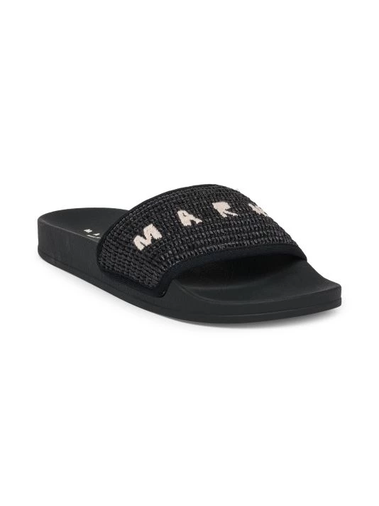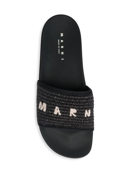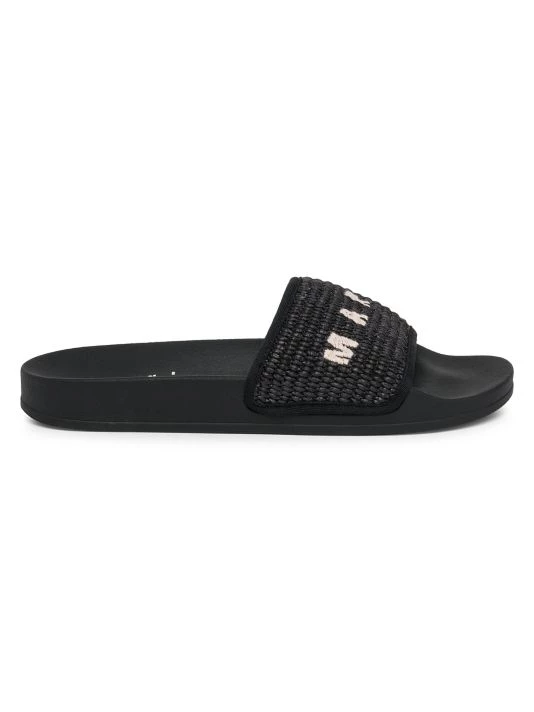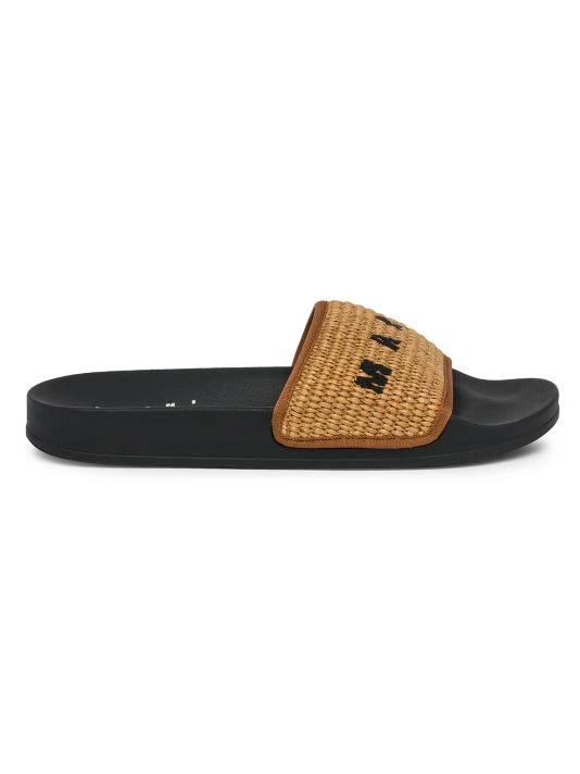 These pool slides are elevated with a woven logo and a raffia finish across the vamp.