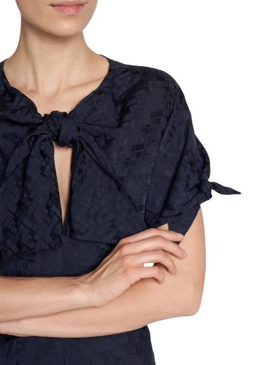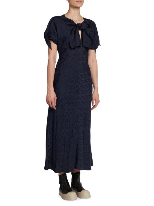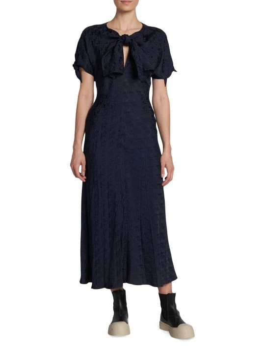 Marni’s midi-dress is cut with an A-line silhouette and features a pleated skirt. Tie details at the neck and short sleeves add an ultra-feminine flair to this sophisticated style.