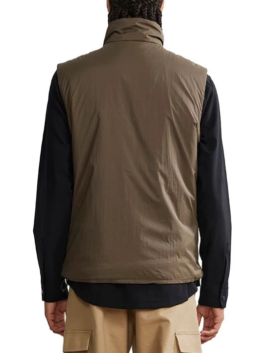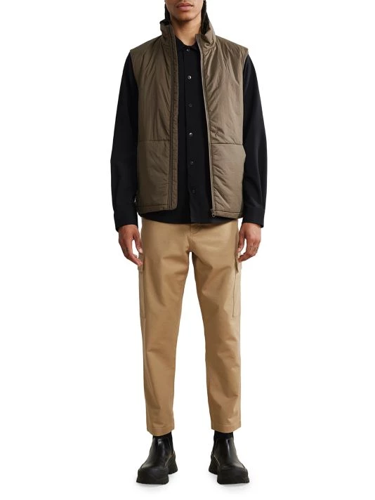 Focusing on versatility and functionality, NN07 created what they label an Urban Collection, inspired by three different stories—Commuter, Denim, and Weekend. Expertly crafted from fabrics like cotton, leather, and nylon, “Commuter” includes easy-to-layer essentials, “Denim” is made up of oversized knitwear, and “Weekend” focuses on nostalgic Scandinavian-styled outerwear. This lightly padded vest features a mockneck and a split kangaroo pocket.