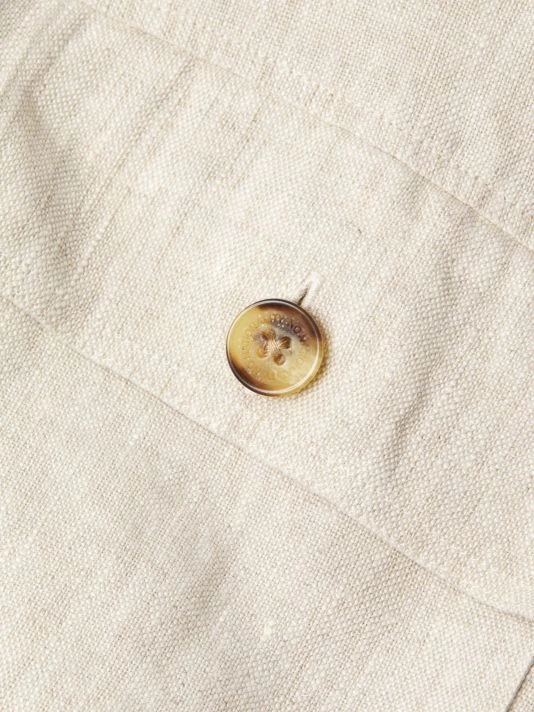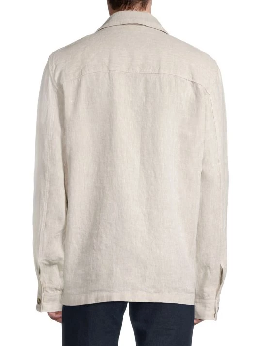 From the High Summer Collection. A hybrid jacket in soft linen features two chest pockets with flap closure and patch pockets at the waist and is topped with engraved logo buttons.